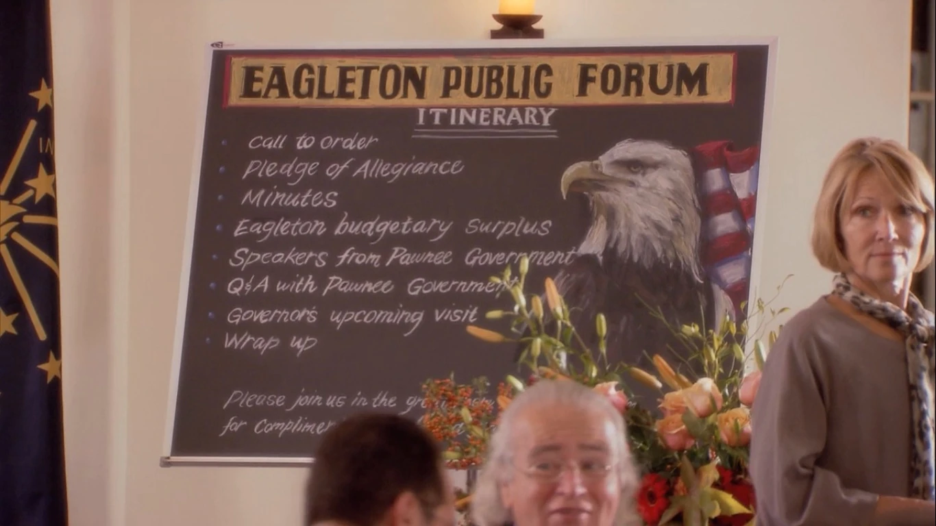 Eagleton, Indiana was a town that lies to the northwest of the city of Pawnee and had a population of 9,500. Shortly after Pawnee was founded in May of 1817, a group of the wealthiest and more prominent citizens, finding the soil untenable and the smell unpleasant, "evacuated" to the west and founded Eagleton. Eagleton is located on top of a hot spring which allows them to grow plants that other cities in Indiana cannot plant. According to Leslie Knope, Eagleton is "the land of rich, snobby jerks". She also accuses the town of having "stole all our money" before seceding two centuries back. Former Eagletonians have a very negative reputation among most Pawneeans, and vice versa.