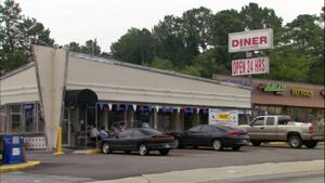 The exterior shot of the diner, seen in the picture below, is actually the Landmark Diner Jr. on Cheshire Bridge Rd. in Atlanta, GA, close to the intersection with Lindburgh Rd/Lavista Rd. Today, the shot would be different, as you would now see the Reserve at Lavista Walk apartments behind the diner, built sometime after the original footage was taken.